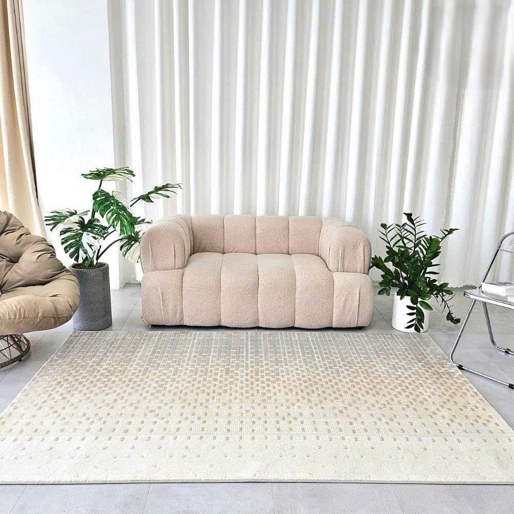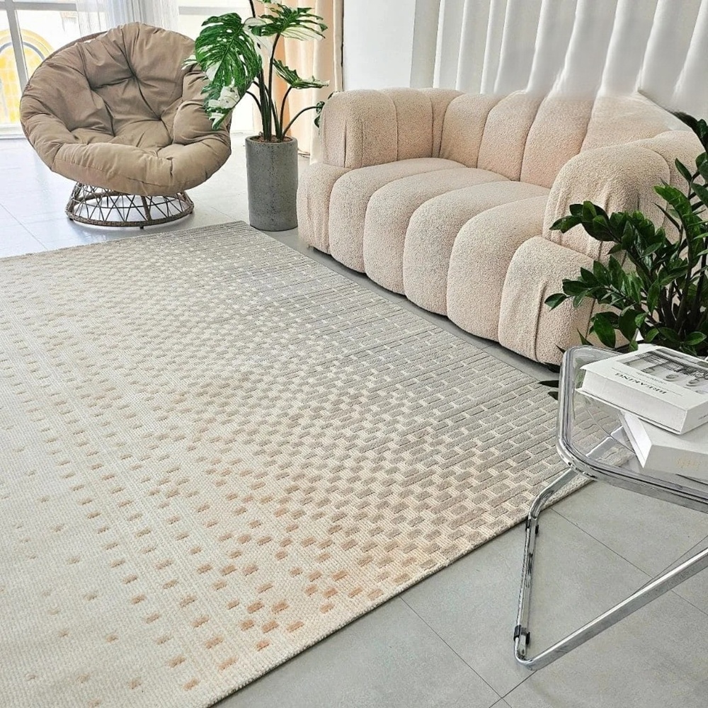 Thảm trang trí dệt 3D KANSO gây ấn tượng mạnh với hoa văn hình học mềm mại, tạo nên chiều sâu cho không gian phòng khách. Mỗi ô vuông nhỏ trên bề mặt thảm trải sàn mang đến một hiệu ứng thị giác độc đáo, tạo cảm giác sống động mà không gây rối mắt. Bề mặt thảm lót sàn hiện đại được dệt tinh tế, mang lại cảm giác mềm mại, dễ chịu mỗi khi bước chân lên. Sự kết hợp giữa công nghệ dệt 3D từ mặt đáy chắc chắn và thiết kế hài hòa giúp không gian sống của bạn trở nên thanh thoát hơn.